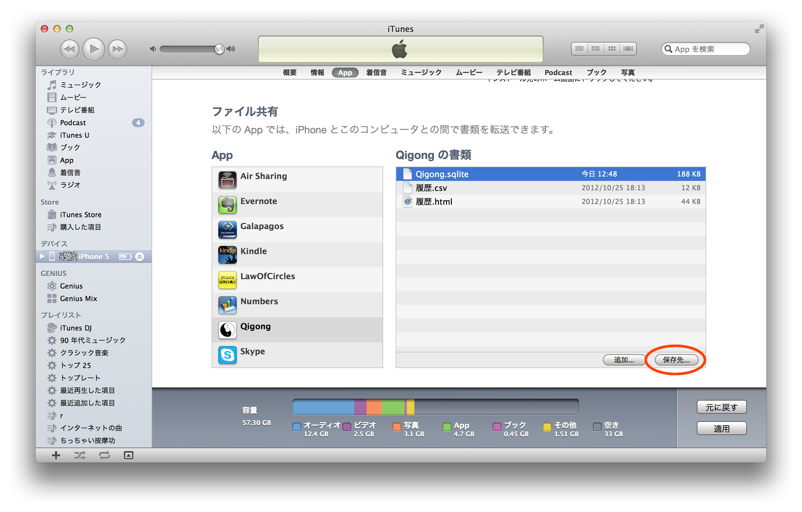 1.5. 「Qigong.sqlite」を選択して、「保存先...」ボタンをクリックし、任意の場所にファイルを保存します。